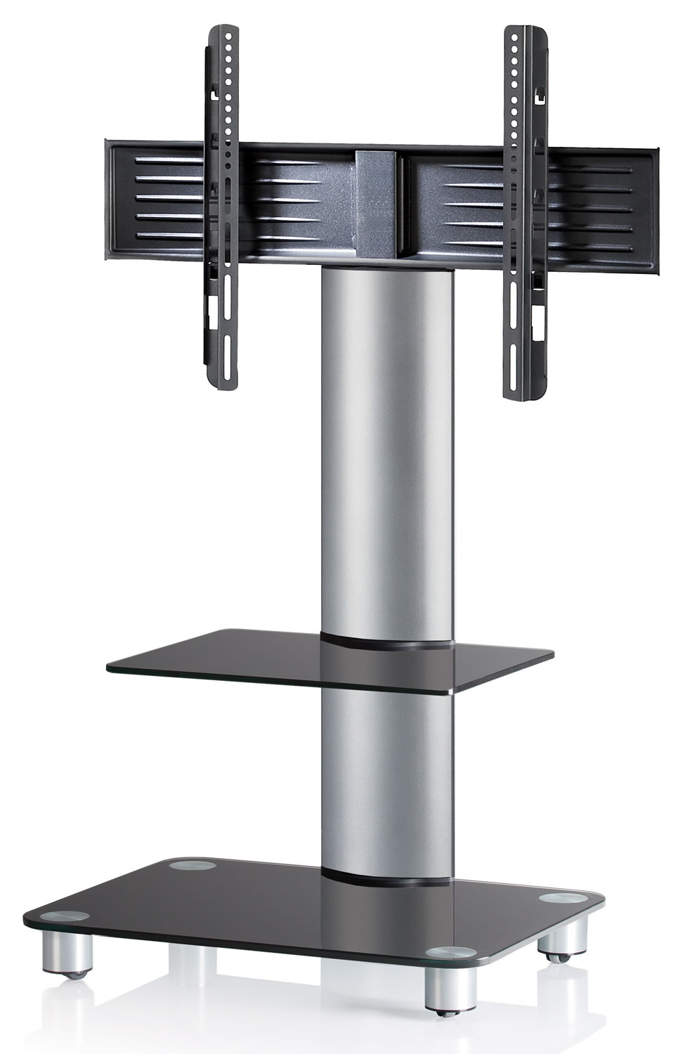 VCM TV-Standfuß "Tosal Schwarzglas" mit Aluminium Standrohr Silber gebürstet und Zwischenboden Schwarzglas